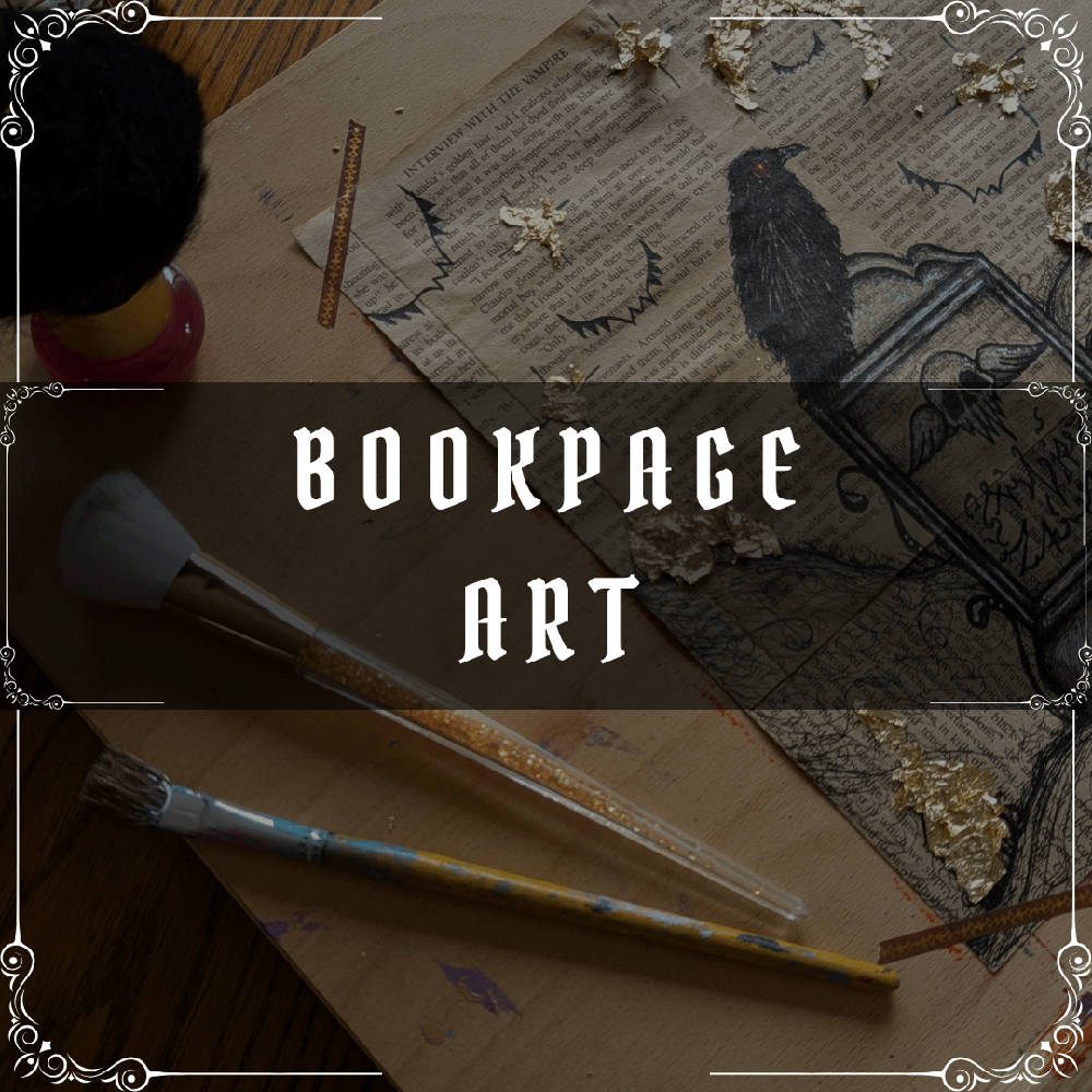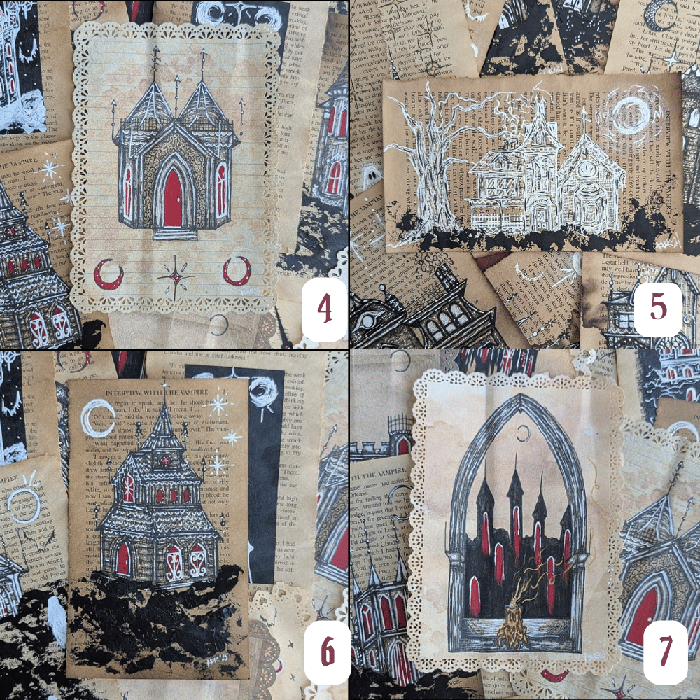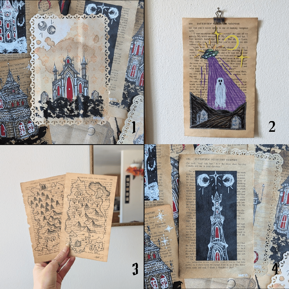 All art is done on hand stained book pages from a copy of Anne Rice's Interview With The Vampire. Ink or mixed media was used.